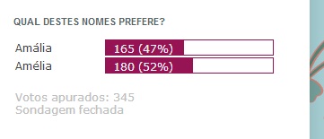 Aproveitando a sugestão deixada aquando do duelo Amália vs Olívia, vou fazer a sondagem: entre Amélia e Amália, qual escolheriam? Não se esqueçam de votar!
