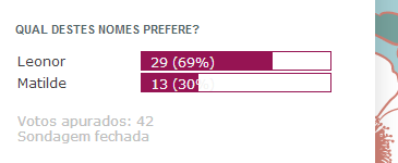 Do vosso ponto de vista, estes nomes ainda continuarão a reinar por bastante tempo? Quanto ao futuro - eu apostei na dominação de Alice, Clara e Eva - que nomes poderão substituí-los? E claro, como isto é um duelo, qual destes nomes preferem? Não se esqueçam de votar!
