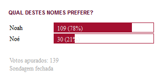 Entendo o fascínio de algumas pessoas por Noah - o H final passa uma imagem de "nome do mundo", e a terminação em "oa" é delicada e única. Já o E final de Noé é estridente. É como ver dois bebés no berçário, um deles dormindo e o outro a chorar desalmadamente. O calminho seria o Noah, o agitado, o Noé. E pergunto: se estivessem a passear pela rua e ouvissem chamar por Noé e por Noah, pensariam que os dois tinham a mesma idade?